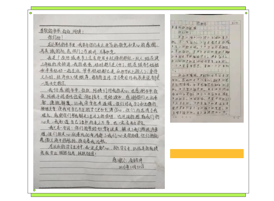 孩子们在信里谈到了生活和学习情况,谈到了对自己未来的展望,还表达了要回馈社会的信念。他们对学习有了更多动力,也给未来绘上了色彩。这让我们看到了努力的意义,也更加坚定了继续开展助学类项目的决心,接下来北京维康慈善基金会将发挥自己的作用,携手更多爱心企业及爱心人士,投入到慈善助学项目中,更好地灌溉青青幼苗茁壮成长!
